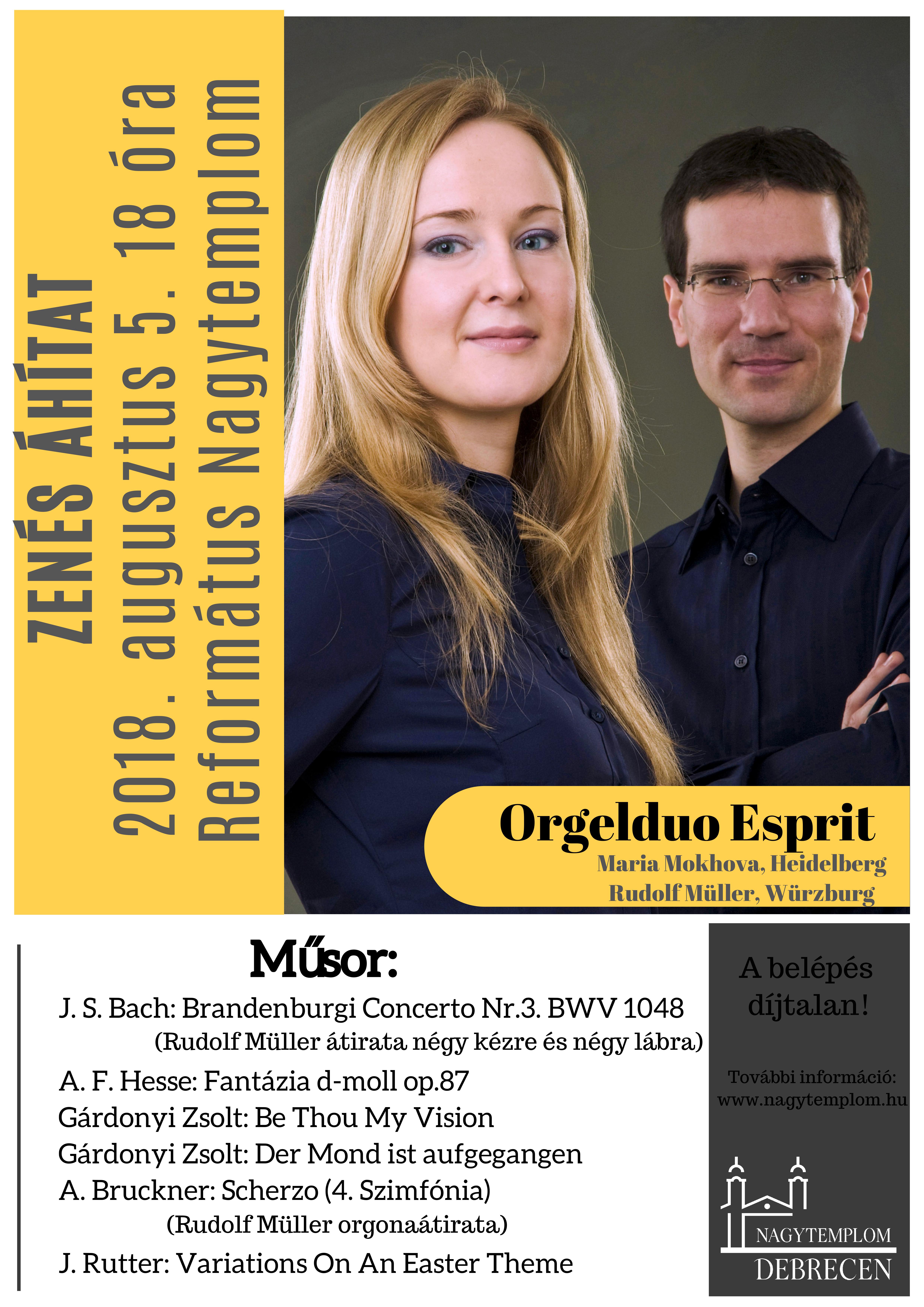 Mint minden hónap első vasárnapján, augusztus 5-én ismét zenés áhítaton vehetnek részt az érdeklődők a Debreceni Református Nagytemplomban. Az orgonakoncerttel kiegészített istentisztelet művészpárosa a német Orgelduo Esprit. Maria Mokhova (Heidelberg) és Rudolf Müller (Würzburg) a világhírű darabokat egyedülálló módon, négy kézzel és négy lábbal szólaltatják meg a Nagytemplom 180 éves hangszerén.