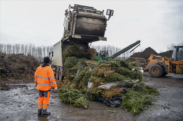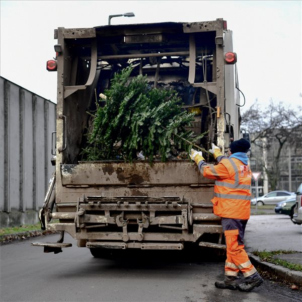 Kidobott karácsonyfát rak kukásautóba az AKSD Városgazdálkodási Kft. dolgozója Debrecenben 2021. január 6-án. MTI/Czeglédi Zsolt[/caption]