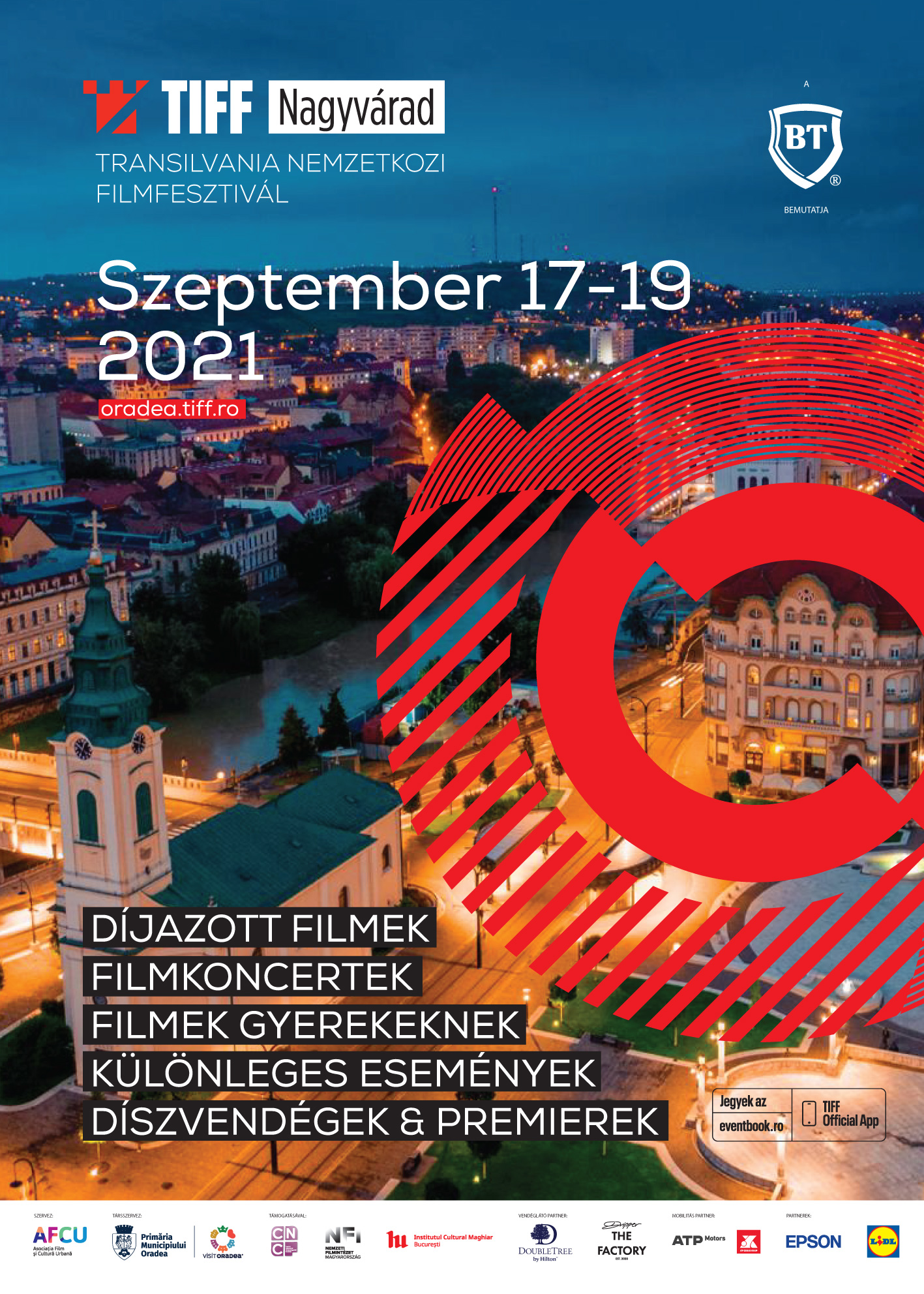 Premier előtti vetítésekkel, őszi filmújdonságokkal, és izgalmas kísérőprogramokkal érkezik szeptember 17. és 19. között Nagyváradra a Transilvania Nemzetközi Filmfesztivál. Idén a Szent László tér, a Barokk Palota, a színház és a filharmónia ad otthont a vetítéseknek és a neves rendezőkkel, színészekkel folytatott beszélgetéseknek. Ezúttal sem maradnak el a magyar filmek, láthatunk majd nagyváradi vonatkozású alkotást is, e mellett a filmrajongók magyar filmes alkotókkal is találkozhatnak.