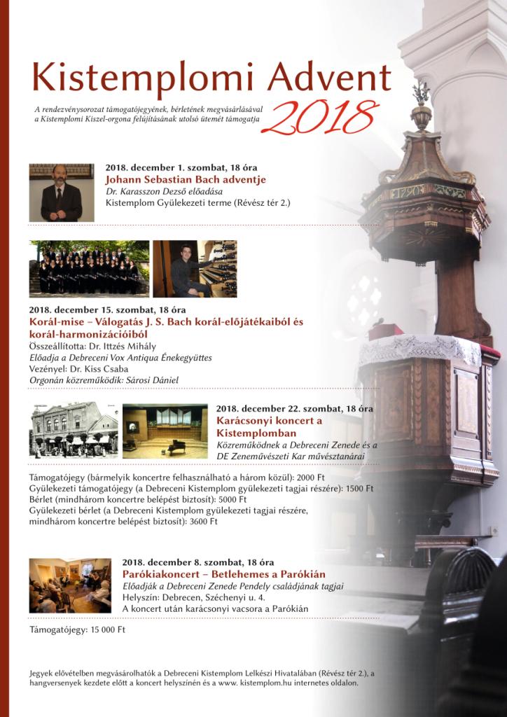 Első ízben rendezik meg a debreceni Református Kistemplomban a Kistemplomi Advent 2018 programsorozatot. A különleges estek támogatójegyeinek, bérleteinek megvásárlásával a kistemplomi Kiszel-orgona felújításának utolsó ütemét is támogathatjuk. Az orgonát 1862 és 1881 között építette Kiszel István, Debrecen város szülötte, nagyváradi orgonaépítő, aki e hangszer építése miatt egész műhelyével Debrecenbe költözött.