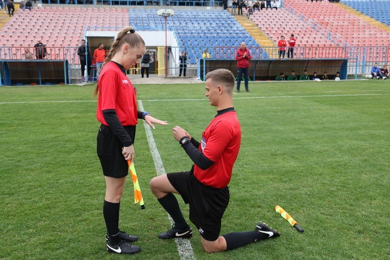 Bejárta a Bihar megyei sajtót az a kép, amelyen egy partjelző látható, amint letérdel a pályán a másik partjelző előtt, aki látható módon a gyűrűsujját nyújtja a ?sporttárs? felé. Bármennyire is ritka még mifelénk a nőnemű játékvezető, azért már ott vannak a labdarúgó pályákon, és lám, ha ott vannak, a lánykérés veszélyének is ki vannak téve. Persze a képen nem az látszik, mintha Duma Gyöngyi veszélyben érezné magát, láthatóan szívesen nyújtotta a kezét az előtte térdelő kérője, Matica Marius felé, és a kérdésre, hogy akar-e a ?sporttárs? felesége lenni, azt válaszolta: ?igen, teljes lelkemből?! Ezek után az ujjára került az eljegyzési gyűrű - és kezdődhetett a mérkőzés.