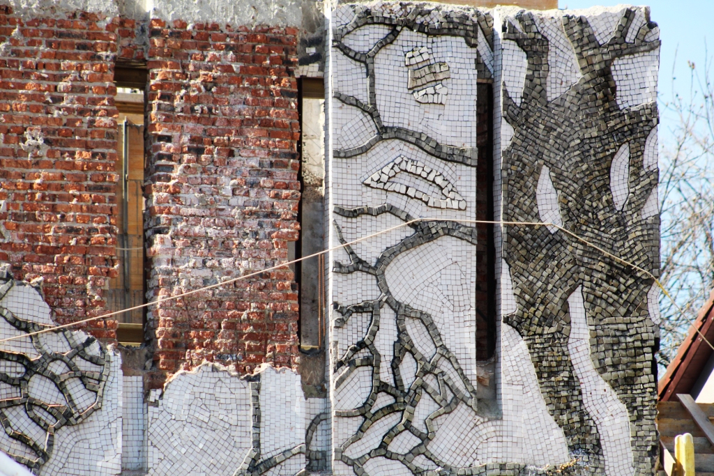 Lebontották a nagyváradi Patria mozi homlokzatát díszítő 350 négyzetméteres márványmozaikot. A Három fa című alkotás a Munkácsy Mihály-díjas erdélyi képzőművész, Jovián György munkája, melyet 1979?1982 között alkotott. A volt mozit átalakítják, bevásárlóközpontot létesítenek helyére. Fotók: Varga Erzsébet Mandy