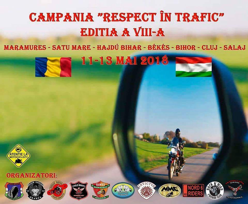 Május 11. és 13. között, magyarországi és romániai motoros egyesületek szervezésében ismét útjára indul a Tiszteljük Egymást a Közlekedésben/Respect în trafic elnevezésű nemzetközi motoros túra. A túra résztvevői 2 magyarországi és 5 romániai megye érintésével megközelítőleg 836 kilométernyi utat járnak be. Tavaly több mint 300 motoros vett részt a nemzetközi figyelemfelhívó akcióban.