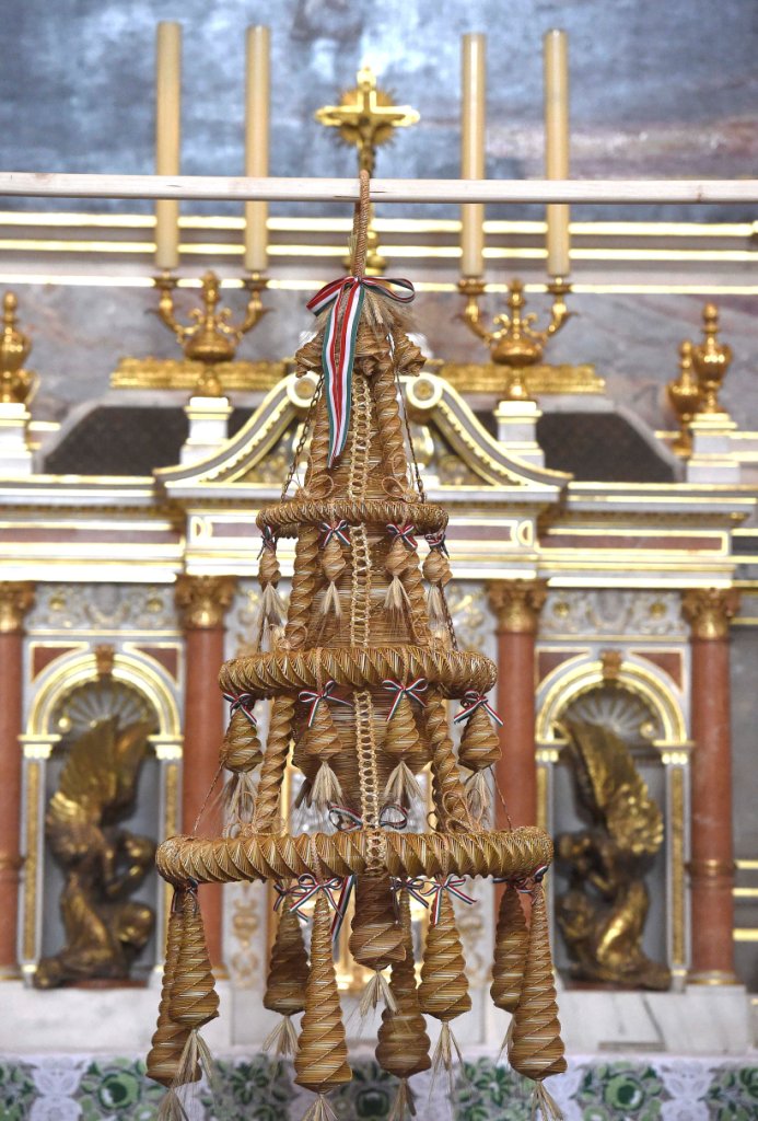 Már látható a budapesti Szent István-bazilikában a Kárpát-medence aratókoszorúja, amelyet augusztus 20-án a Szent Jobb körmeneten is megtekinthetnek az érdeklődők.