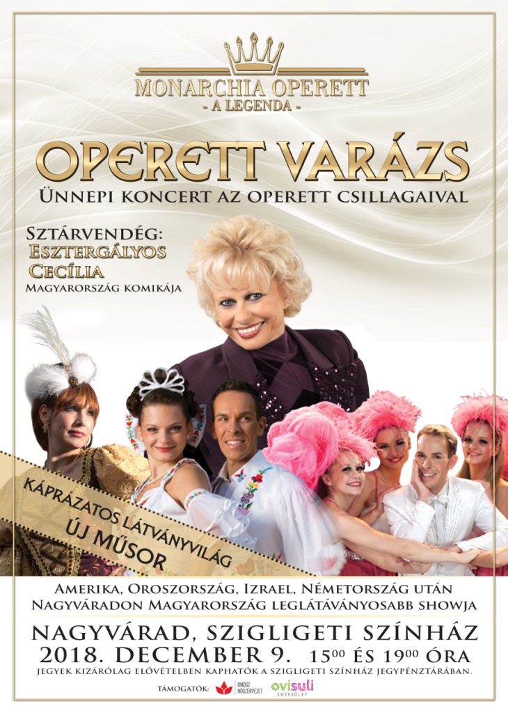 Hajmási Péter, Hajmási Pál, Szép város Kolozsvár, Te rongyos élet, Jaj, cica, eszem azt a csöpp kis szád, Délibábos Hortobágyon. Ki ne ismerné ezeket a világhíres melódiákat? A Monarchia Operett társulatának előadásában hallható magyar operett dallamai meghódították a világot, bejárták többek között az Amerikai Egyesült Államokat, Oroszországot, Izraelt és Németországot, s a következő hónapban Nagyváradra is elérkezik Magyarország egyik leglátványosabb show-ja, melynek sztárvendége, az este házigazdája, sokak kedvenc komikája, Esztergályos Cecília.
