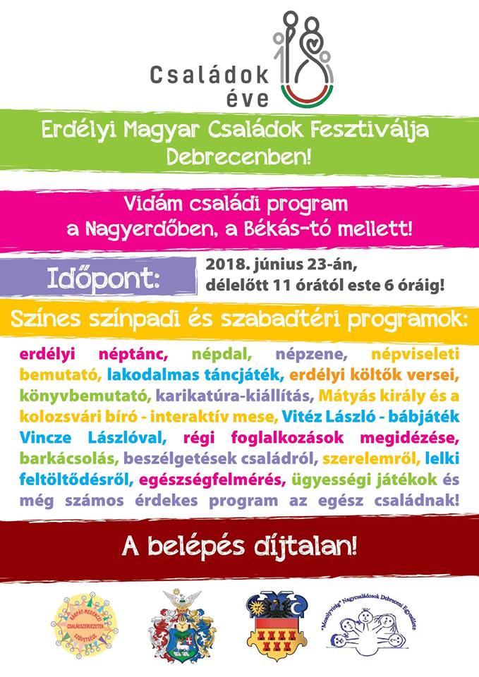 Fergeteges, tágabb értelemben is családi fesztiválnak ad otthont Debrecen ezen a hétvégén. A Kárpát-medencei Családszervezetek Szövetsége június 23-án, a Családok éve 2018 programsorozat keretében, a nagyerdei Békás-tó mellett rendezi meg az Erdélyi Magyar Családok Fesztiválját. Az eseményre, amelyet a város is támogat, több száz erdélyi családot és több mint ezer belföldi résztvevőt várnak a szervezők.