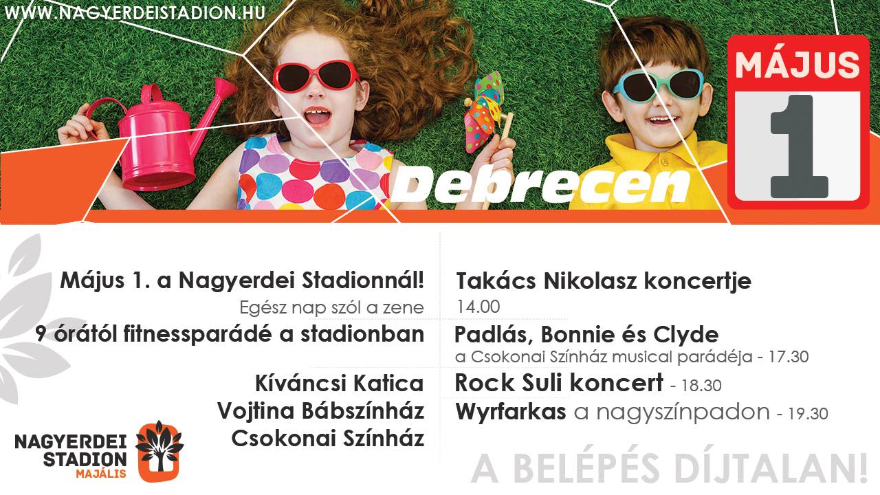 Szórakozás egész nap: reggel 9 órától az éjszakába nyúlik a Nagyerdőn a majális. A Stadiont övező parkban és a magában a Stadionban folyamatosak a programok május 1-én. A vendéglátó helyek egész nap várják és kiszolgálják a közönséget.