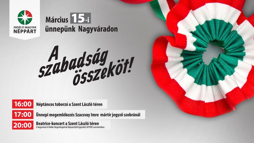 Az Erdélyi Magyar Nemzeti Tanács, az Erdélyi Magyar Néppárt, és a Magyar Polgári Párt az új magyar egység jegyében közös ünneplésre hívja és várja az 1848 hőseire megemlékezni vágyó nagyváradi magyarokat. Az elmúlt évek hagyományaihoz híven, idén is gazdag és színes programmal várunk mindenkit elsősorban ünnepségünk kiemelt helyszínére, a Szent László térre, de a megemlékezés többi helyszínére is - írják meghívójukban.