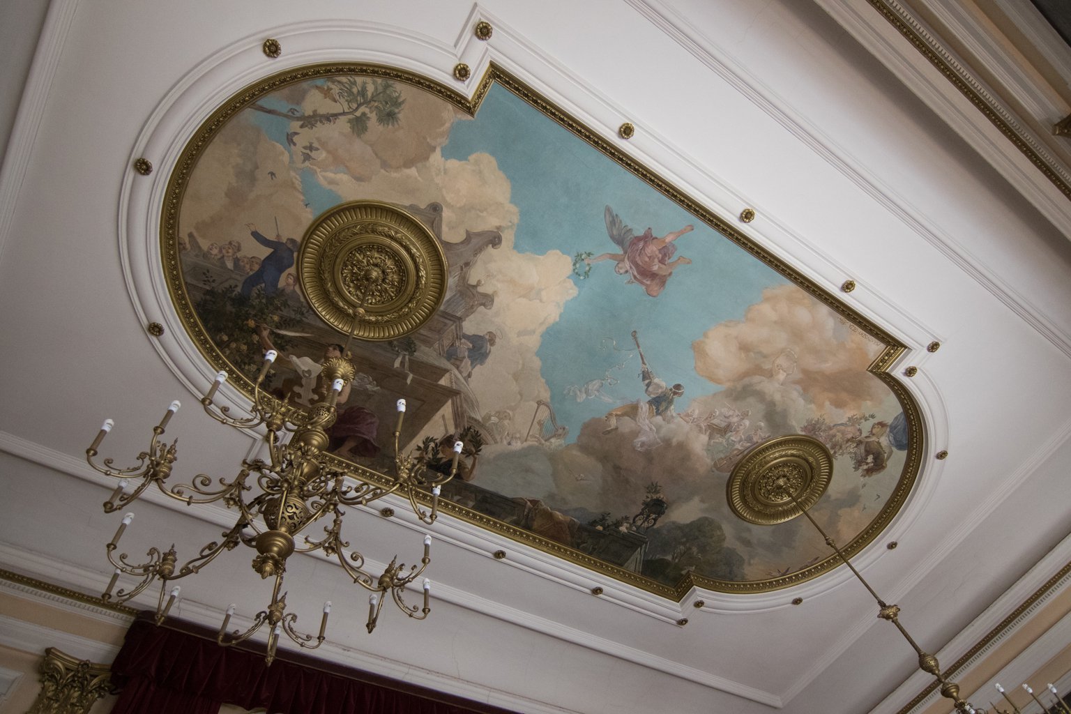 A Zenedének kiváló akusztikájú koncertterme van, amelyet Mirkovszky Géza A zene allegóriája című mennyezetfreskója díszít.[/caption]