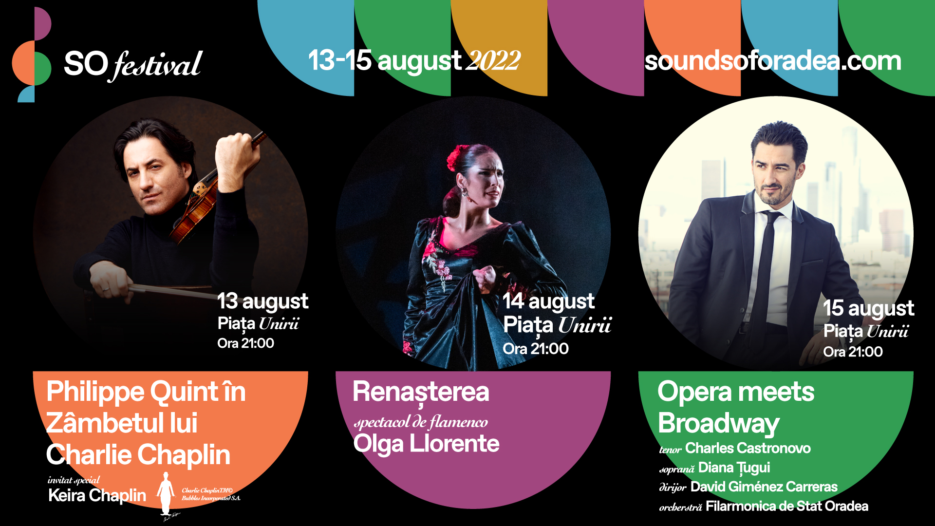 A Nagyvárad és Környéke Turizmusát Népszerűsítő Egyesület (Visit Oradea) idén egy új, világhírességeket felvonultató zenei fesztivált indít útjára. Augusztus 13. és 15. között, a Szent László téren unokája, Keira Chaplin és Philippe Quint hegedűművész hozza el nekünk Charlie Chaplin muzsikáját, Olga Llorente és flamenco tánciskolája is érkezik, a világ egyik legelismertebb tenorja, Charles Castronovo, a híres szoprán, Diana ?ugui társaságában pedig operaáriákkal és musicalekkel szórakoztatja majd azokat, akik jegyet váltanak.