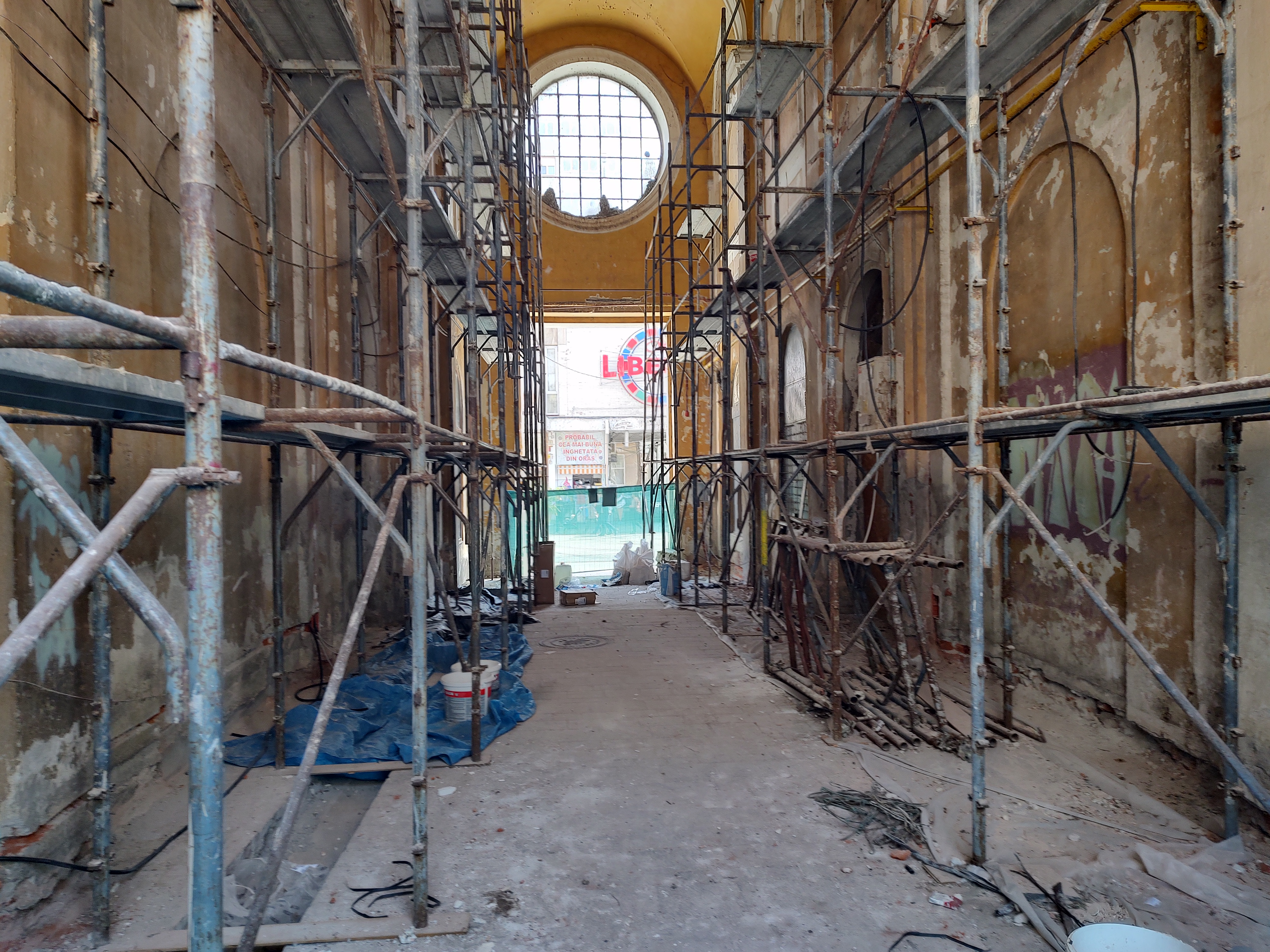 Az állványok felállításával és a falba temetett villanyvezetékek cseréjével végre elkezdődött a nagyváradi Bazárépület passzázsának felújítása. A Madách utcát a Fő utcával összekötő átjáró rehabilitációja már több éve várat magára.