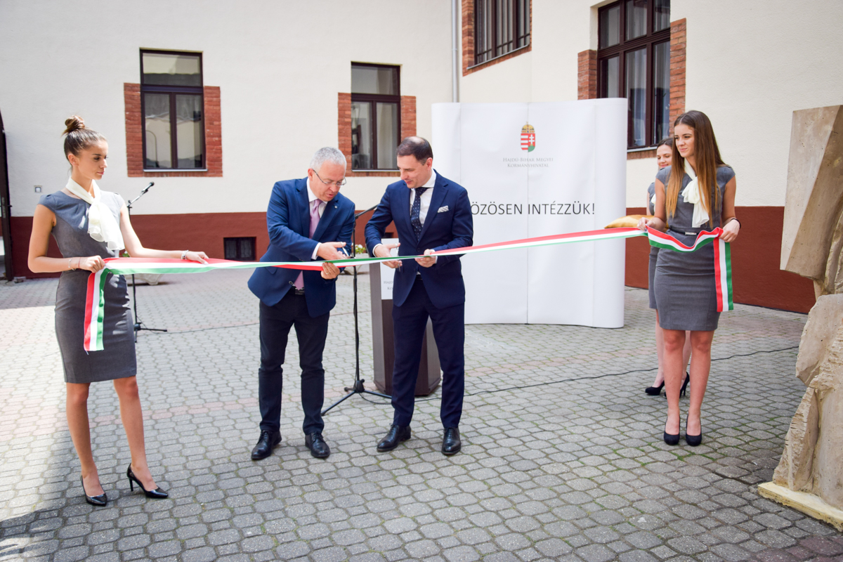 A szalagot Rácz Róbert, a Hajdú-Bihar Megyei Kormányhivatal kormánymegbízottja, és Tuzson Bence, a Miniszterelnökség közszolgálatért felelős államtitkára vágta át. (Fotók: hbmo.hu)[/caption]