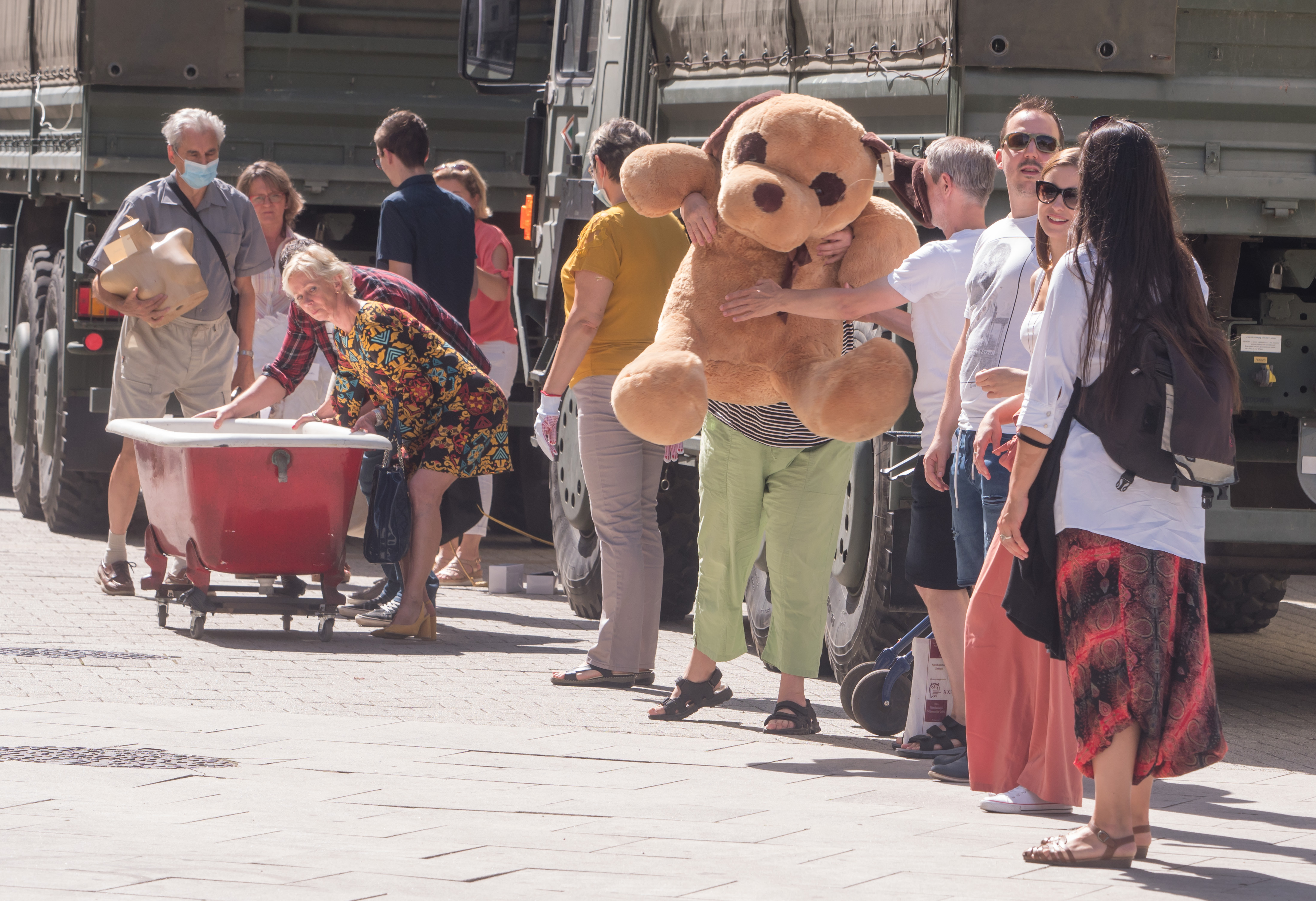 Valódi kapcsolatépítő tréning volt az élőlánc a színház dolgozóinak is, hisz a színészektől kezdve a bérügyi dolgozókig sokan adogatták egymásnak és a résztvevőknek apróbb nagyobb kellékeket, jelmezeket. Néhol lelassult a sor, mert ki-ki próbálgatott egy kalapot, egy ruhát, vagy épp felhívtak valakit a Macskajáték ódon telefonjával, vagy a címkék alapján próbálták beazonosítani, mikor kin láttak egy-egy ruhadarabot, cipőt, csizmát. Mészáros Ibolya is megszakította az Őszintén szólva próbáját, hogy beállhasson a kígyózó sorba. ?Szívmelengető volt látni azt a sok embert, aki eljött, hogy velünk együtt jelképesen kiköltöztesse a színházat. Jó élmény volt kézről-kézre adni a sok kelléket, jelmezt, parókát, és feleleveníteni azt a sok emléket, ami ezekhez a tárgyakhoz köt minket.?