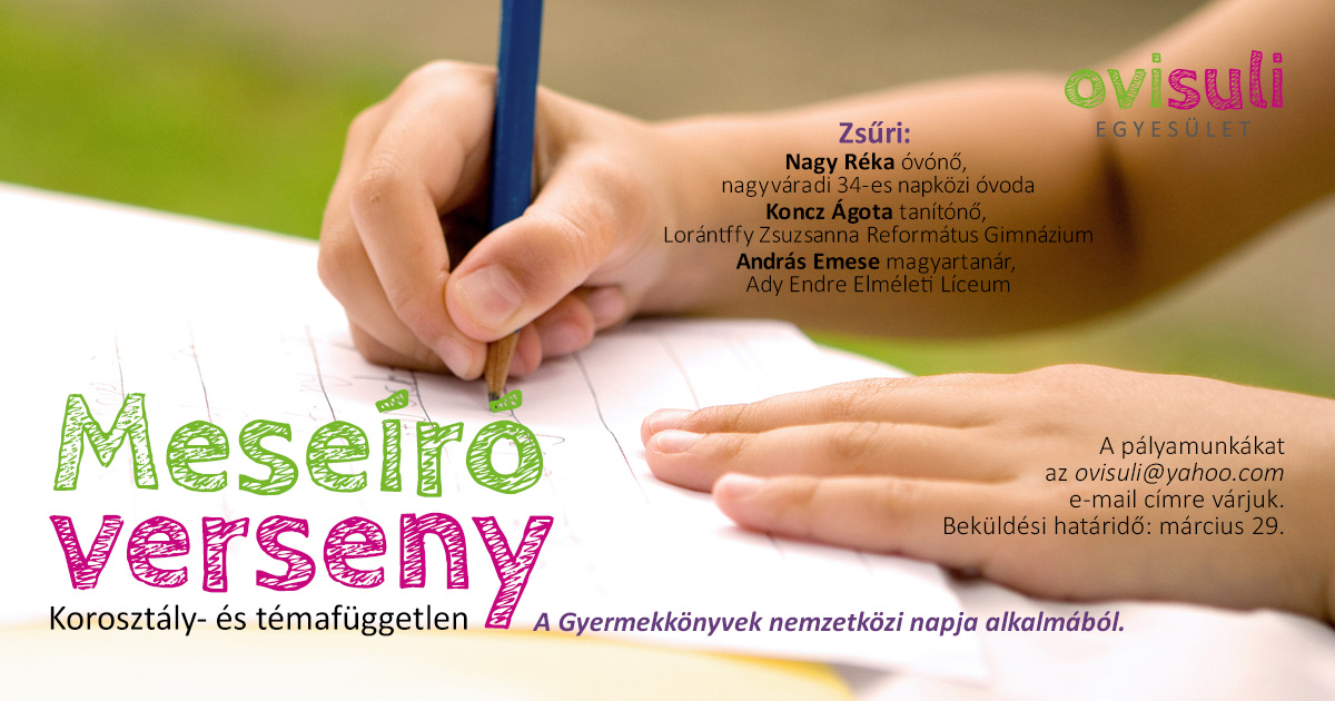 Az Ovisuli Egyesület Meseíró versenyt hirdet a közelgő Gyermekkönyvek Nemzetközi Napja alkalmából. A verseny korosztály- és témafüggetlen, kikötés csupán az, hogy a mese szereplőinek kitalálásakor kötelezően magyar neveket kell használni, a történet pedig kötődjön egy Bihar megyei településhez. A pályamunkákat az ovisuli@yahoo.com e-mail címre várjuk. Beküldési határidő március 29.