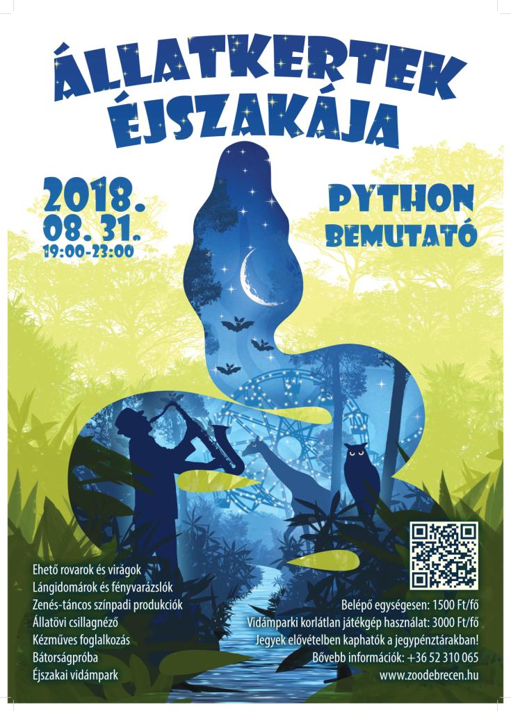Ahogy azt a Debreceni Állatkertben az Állatkertek Éjszakán már megszokhattuk, ebben az évben is egy új állatbemutatót lepleznek le. Az est egyik szenzációjaként átadásra kerül az Állatkert legújabb attrakciója, a Python bemutató. A legmodernebb óriáskígyó terráriumba a látogatók előtt költöznek be az állatkert tigrispitonjai és fogyasztják el vacsorájukat.