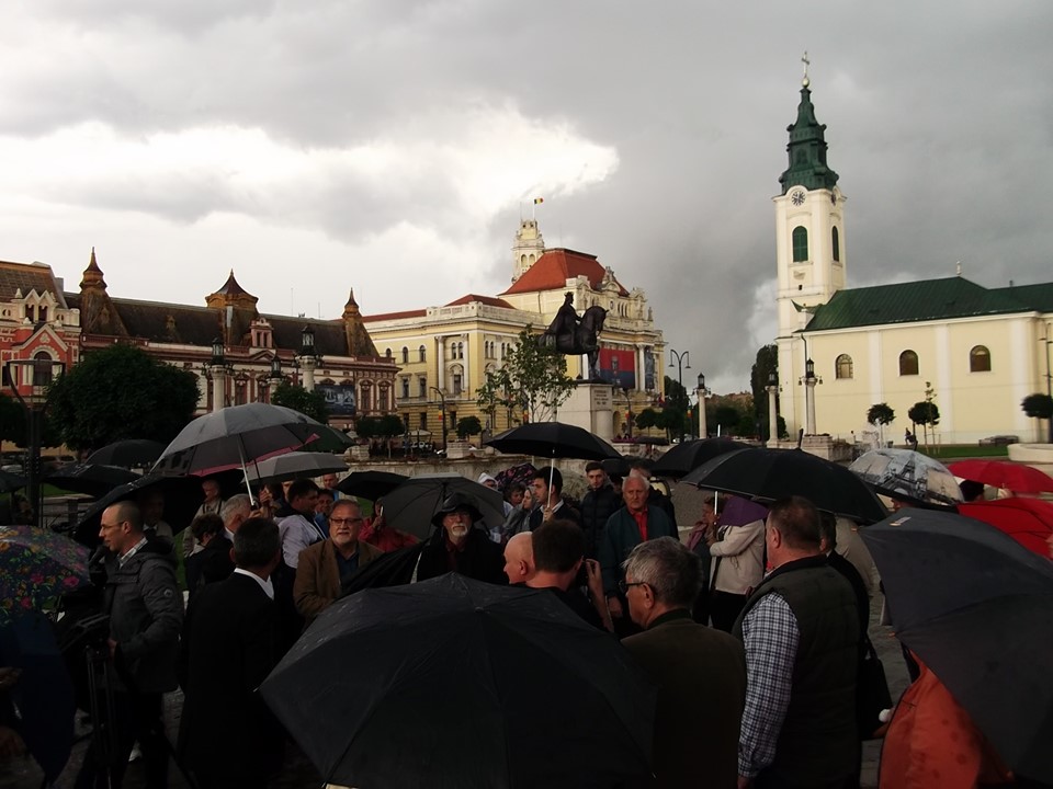 Az esős, viharos időjárás ellenére ma délután sok nagyváradi magyar összegyűlt a város főterén, hogy az Erdélyi Magyar Néppárt által szervezett élőláncot alkotva tüntessen a városalapító Szent László király szobrának felállításáért.