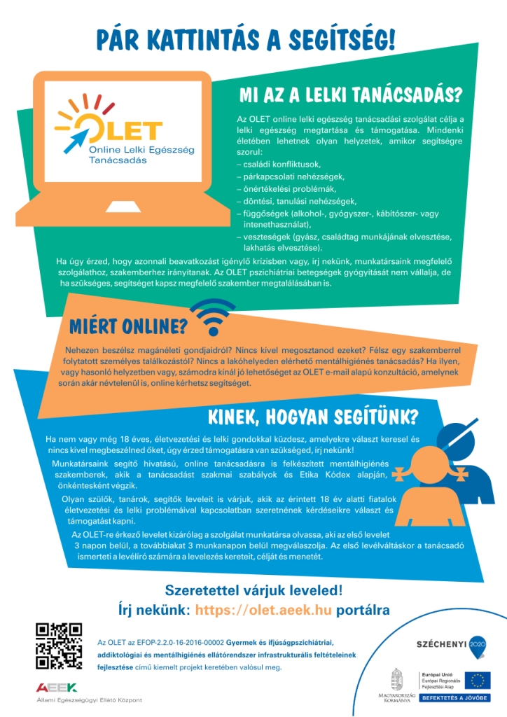 Az EFOP-2.2.0-16-2016-00002 Gyermek és ifjúságpszichiátriai, addiktológiai és mentálhigiénés ellátórendszer infrastrukturális feltételeinek fejlesztése című kiemelt projekt és az OLET szolgáltatás a Széchenyi 2020 program keretében valósulnak meg.