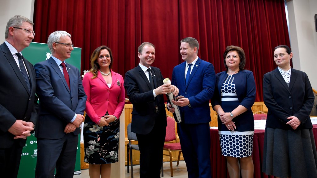 Kép: Fekete Károly, a Tiszántúli Református Egyházkerület püspöke, Soltész Miklós, a Miniszterelnökség egyházi és nemzetiségi kapcsolatokért felelős államtitkára, Vitályos Eszter, az Emberi Erőforrások Minisztériumának (Emmi) európai uniós fejlesztéspolitikáért felelős államtitkára, Oláh István, a Magyar Református Szeretetszolgálat kuratóriumi elnöke, Juhász Márton, a szeretetszolgálat ügyvezető igazgatója, Szabóné Karsai Mária (független) polgármester és Bukáné Zakar Zsuzsanna lelkipásztor (b-j) a szeretetszolgálat számára a Hajdú-Bihar megyei Ebesen készülő raktárépület építésének megkezdése alkalmából tartott ünnepségen 2019. május 15-én. MTI/Czeglédi Zsolt