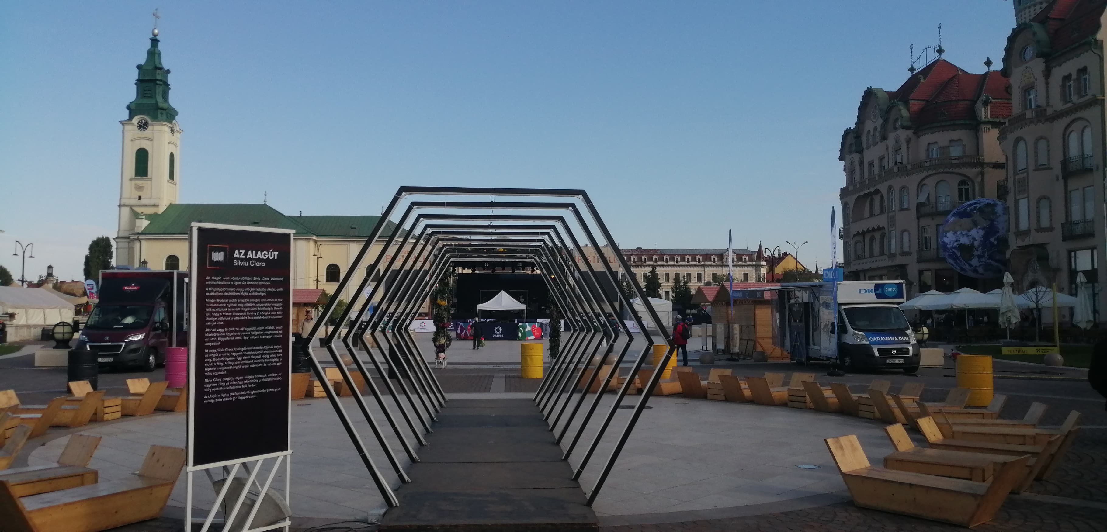 "Az alagút nevű vándorkiállítást Silvio Ciora kolozsvári művész készítette a Lights On románia számára. A fényfolyosót kilenc nagy, világító hatszög alkotja, amik az átkelésre, átsétálásra hívják a közönséget.