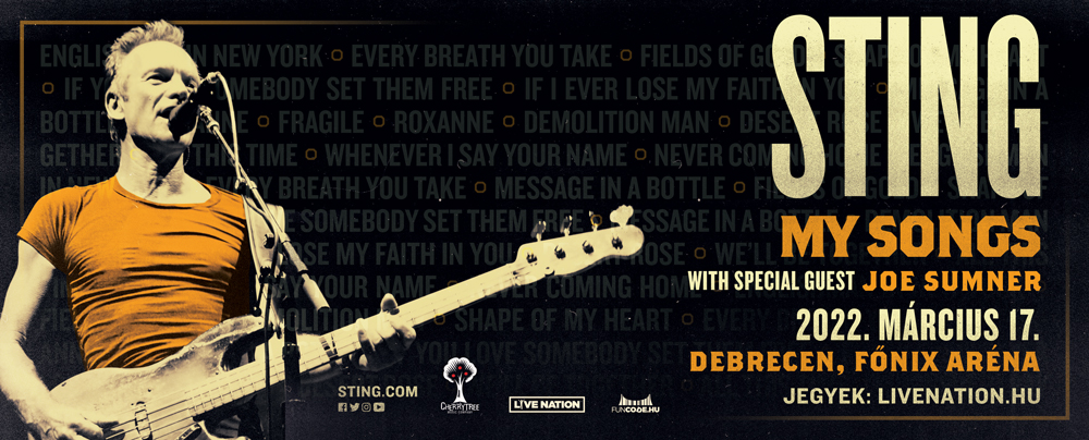Sting My Songs koncertje egy dinamikus show, amely a tizenhétszeres Grammy-díjas előadó pályafutása során írt legnépszerűbb dalait tartalmazza, legyen az akár Police, vagy szóló sláger. Az elejétől a végéig ?mesteri produkciónak? titulált koncert ?zenei utazásra viszi a rajongókat az időben?, olyan nótákkal, mint a Fields of Gold, Shape Of My Heart, Roxanne vagy a Demolition Man ?felejthetetlen előadása.? A rajongók emellett még hallhatják az Englishman In New York, az Every Breath You Take, és a Message In A Bottle számokat is, sok más mellett.