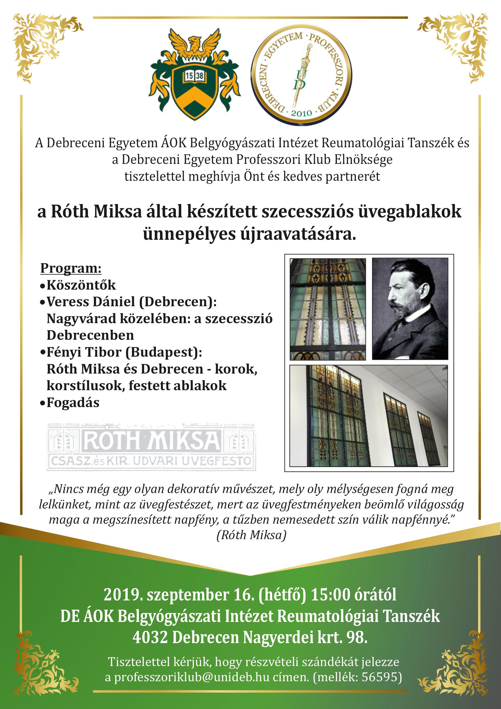 A debreceni építkezések két évtizede alatt Róth Miksa nem csupán üvegfestőként, hanem ? mai szóval ? belsőépítészként is dolgozott. Egyebek mellett ő tervezte az elpusztult Tisza István-emlékfalat és az épületek díszítőfestését is. Róth alkotása a Debreceni Egyetem Díszudvarának kupolája, valamint az Aula öt hatalmas, 20 négyzetméteres üvegfestménye is, amelyeken a Református Kollégium történeti kapcsolatait örökítette meg. Az üvegablakok egy 1944 szeptemberi bombázás légnyomásától megsemmisültek, de korabeli fotók és a Róth Miksa Emlékház eredeti tervei alapján az egyetem alapításának 100. évfordulójára, 2012-re rekonstruálták őket.