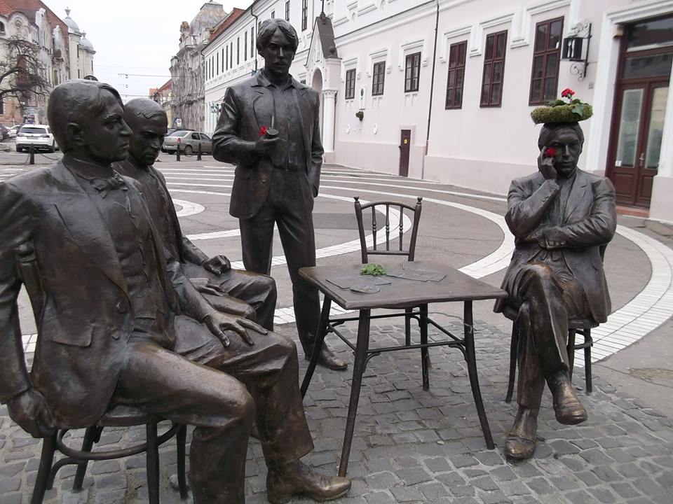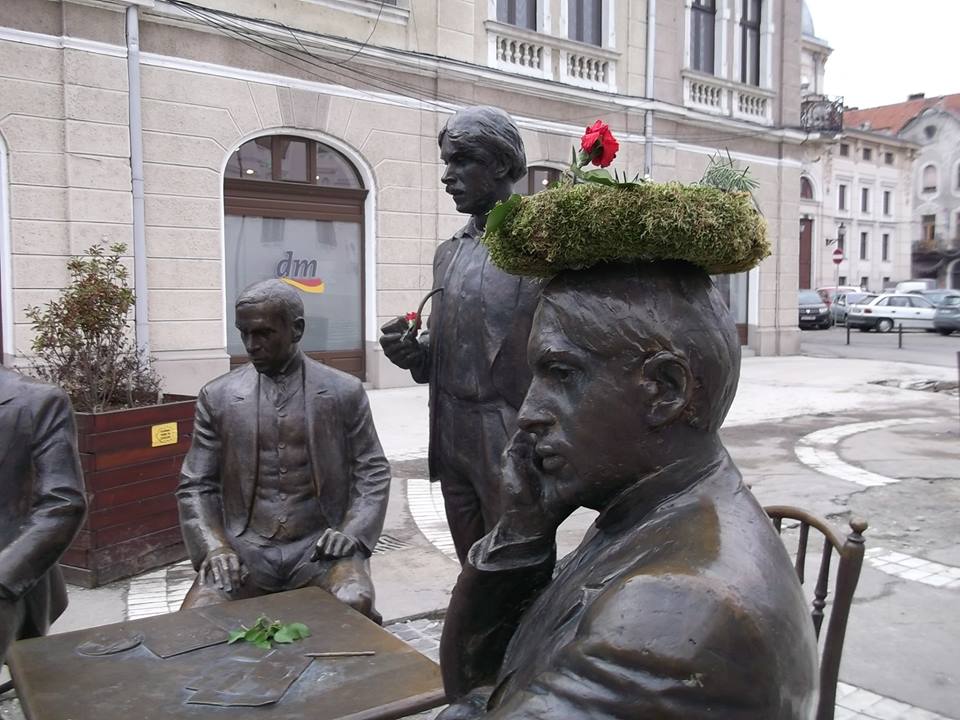 Emőd Tamás és Dutka Ákos (középen) szobra szegfűvel.[/caption]