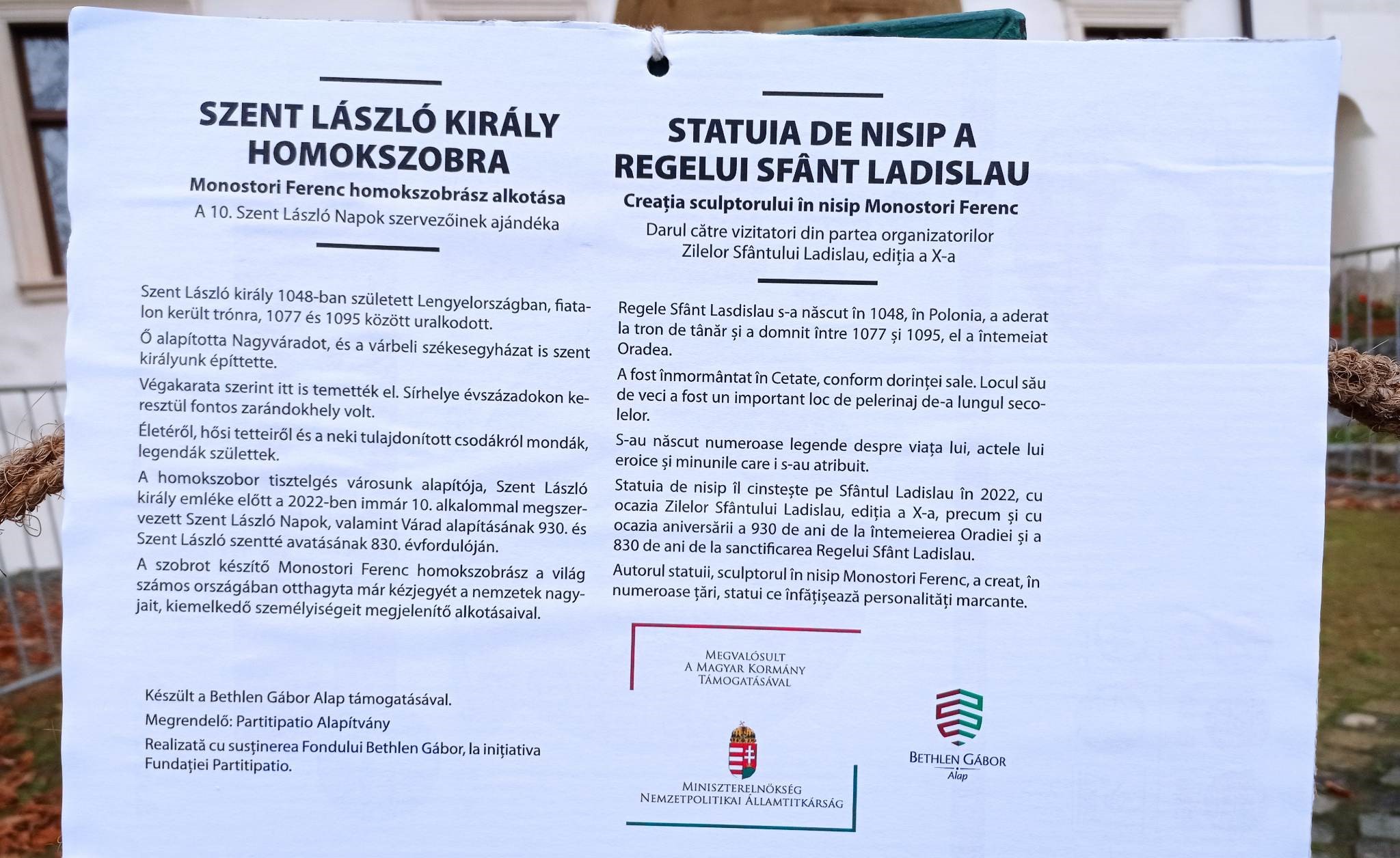 ?A szobrot megrendelő Partitipatio Alapítvány évek óta pályázik a Bethlen Gábor Alapkezelő Zrt. által kiírt támogatásokra. Számos rendezvényünk, kulturális-, sport és gyermekprogramunk valósult így meg.A 2,5 méteres Szent László homokszobor is a Bethlen Gábor Alapkezelő Zrt.-nek köszönhetően készülhetett el, amely kora nyár óta szép éke a nagyváradi várnak. Sok látogatót fogadott. Köszönjük Monostori Ferenc világrekorder homokszobrász munkáját és a Bethlen Gábor Alapkezelő Zrt.-nek ez irányú támogatását is. Ugyanakkor szeretném megköszönni a a Nagyvárad és a Régió Turizmusfejlesztési Egyesületnek (APTOR) hogy azonnal igent mondtak a kérésünkre, és itt, a stratégiailag legjobb helyre befogadták a szobrot. ? ? mondta Mihálka Melinda.