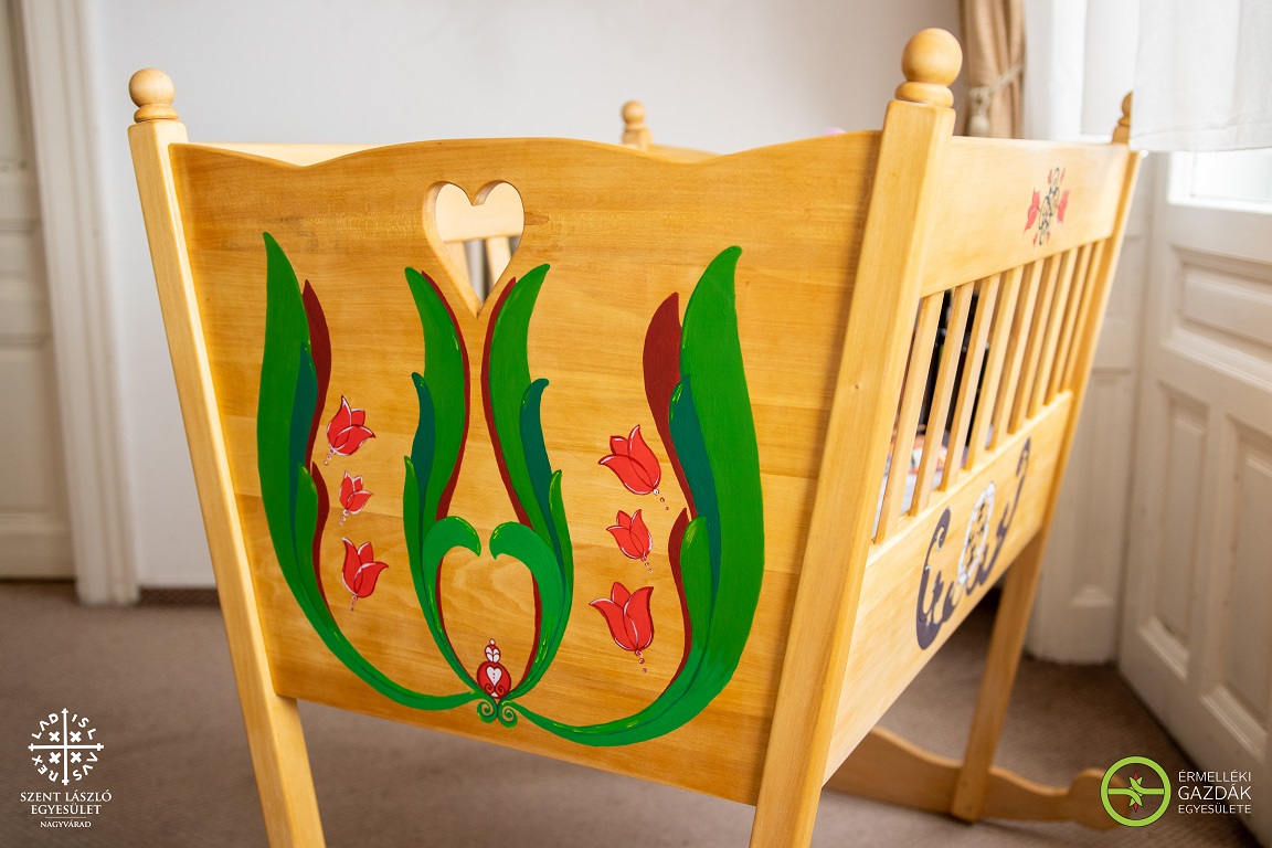 Az új bölcsők is Végh Gyula hegyközcsatári asztalosműhelyében készültek el, a díszítés Köllő Panna, a népi képzőművészet ígéretes gyergyói fiatal tehetsége keze munkáját dicséri. A hársfából készült bölcsők festéséhez ezúttal is kizárólag természetes eredetű, az egészséget nem károsító színezőanyagokat használtak. A bölcsők díszítései ősidőkre visszanyúlva megidézik a Kárpát-medencében található régi magyar templomok mennyezetkazettáinak szín- és formavilágát, úgy, hogy a motívumok jelentéstartalma a születés, az anyaság vállalása, az élet továbbadásának fontossága, az élet ismétlődő újrateremtése, az örök megújulás üzenetét is magukban hordozzák.