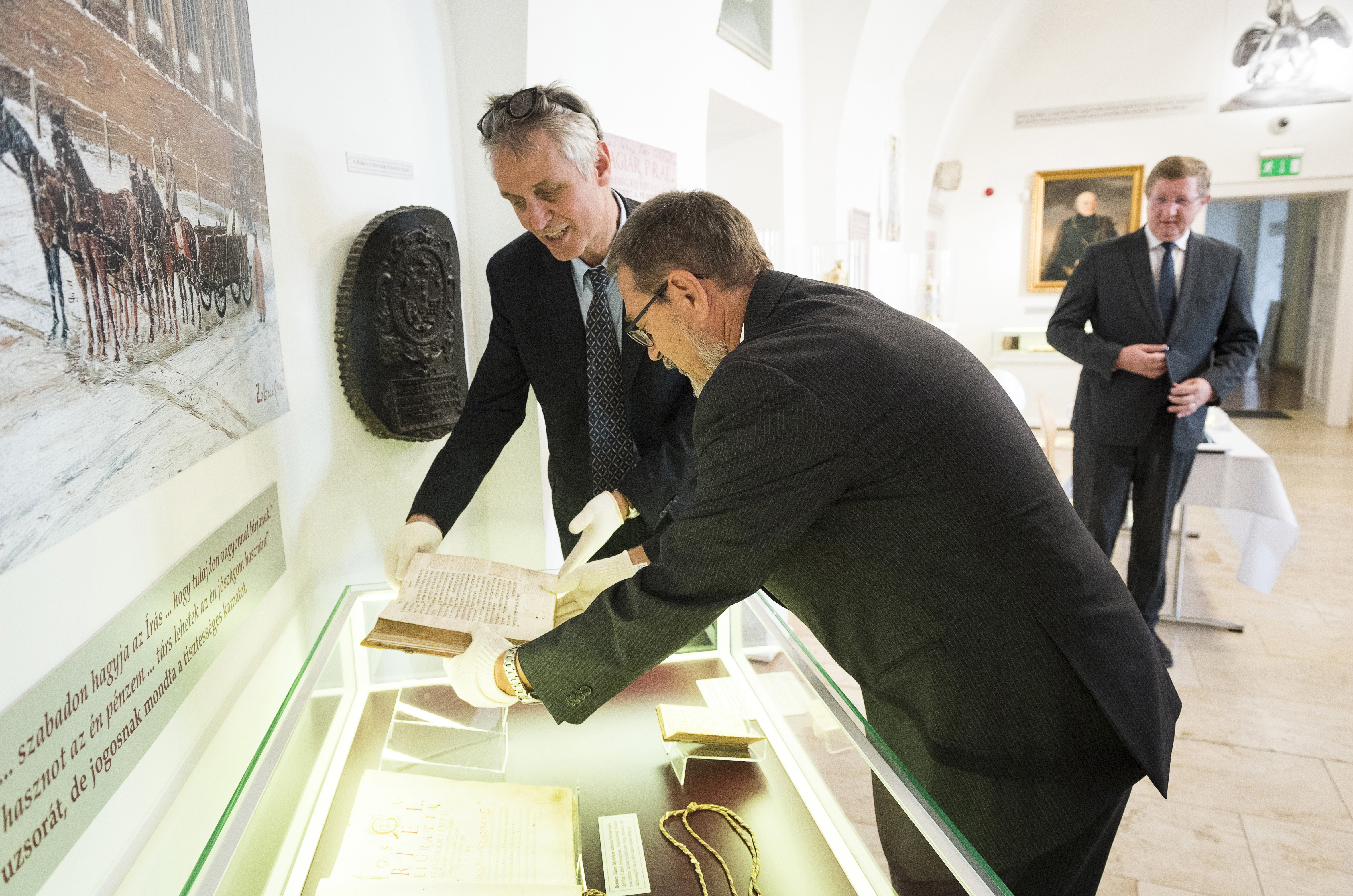 Kép: Gabriel de Montmollin, a genfi Nemzetközi Reformáció Múzeum igazgatója (b) és Gáborjáni Szabó Botond, a Debreceni Református Kollégium gyűjteményi igazgatója a vitrinbe helyezi a genfi diák és debreceni prédikátor, Szikszai Hellopaeus Bálint saját kézírásos jegyzeteivel ellátott 16. századi héber bibliát a könyv hazaérkezése alkalmából tartott sajtótájékoztató után a kollégium múzeumában 2018. augusztus 30-án. A bibliát 2017-ben, a reformáció 500. évfordulójára adta kölcsön a kollégium nagykönyvtára a genfi múzeumnak. MTI Fotó: Balázs Attila