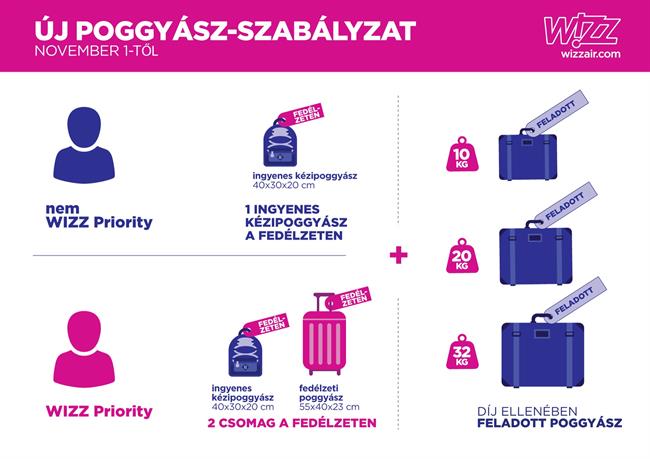 November 1-jével ismét változik a Wizz Air diszkont légitársaság poggyász-szabályzata, aminek alapján minden utas ingyen felvihet legalább egy kézipoggyászt a fedélzetre. Ezen kívül a Wizz Air a már meglévő 20 és 32 kg-os súlyhatárú, feladott poggyászok mellett egy új, 10 kg-os lehetőséget is bevezetett.