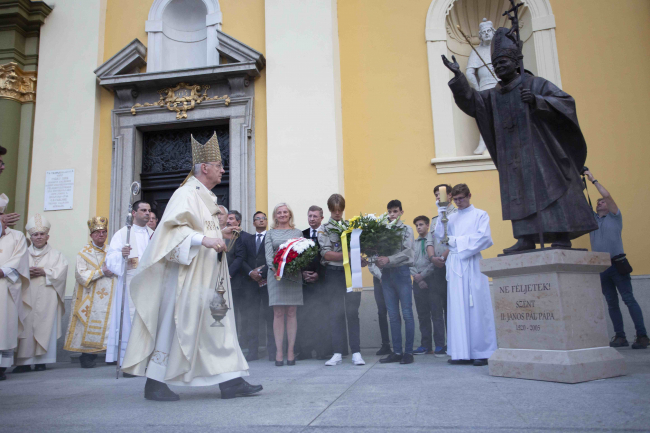 ?30 évvel ezelőtt ezekben az órákban itt tartózkodott egy nagy szent, Szent II. János Pál pápa? ? fogalmazott az alkotás leleplezését megelőző ünnepi szentmisén Palánki Ferenc debreceni-nyíregyházi megyéspüspök a köszöntő gondolataiban az este 6 órakor kezdődő szentmise elején. A főpásztor dr. Ternyák Csaba egri érsek atya személyes élményére utalt, aki 10 éven keresztül a pápa közvetlen munkatársa volt. Az érsek atya azt mondta, ha csak pár percig is beszélgetett a Szentatyával, néhány másodperc múlva azt érezte, hogy a beszélgetés központjában nem a pápa állt, hanem ő maga.