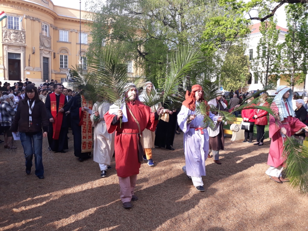 A szamárháton érkező Krisztust és üdvözlőit a Kuckó Művésztanya bibliai kort idéző jelmezesei idézték meg, a debreceni néptáncosok közül a lányok jártak körtáncot a téren.