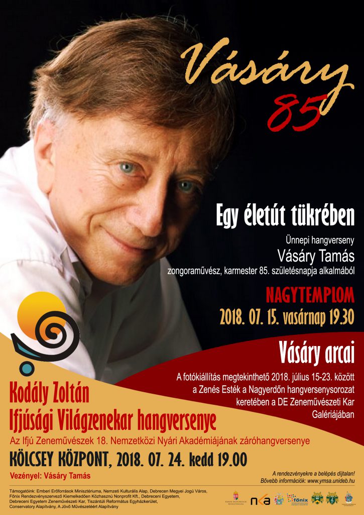A debreceni Református Nagytemplomban, különleges hangversennyel kezdődik július 15-én, vasárnap az Ifjú Zeneművészek Nemzetközi Nyári Akadémiája. ?Egy életút tükrében? címmel, Vásáry Tamás Kossuth-díjas zongoraművész-karmester 85.születésnapja tiszteletére tartanak ünnepi koncertet, amin maga az ünnepelt és a nyári akadémia professzorai is közreműködnek.