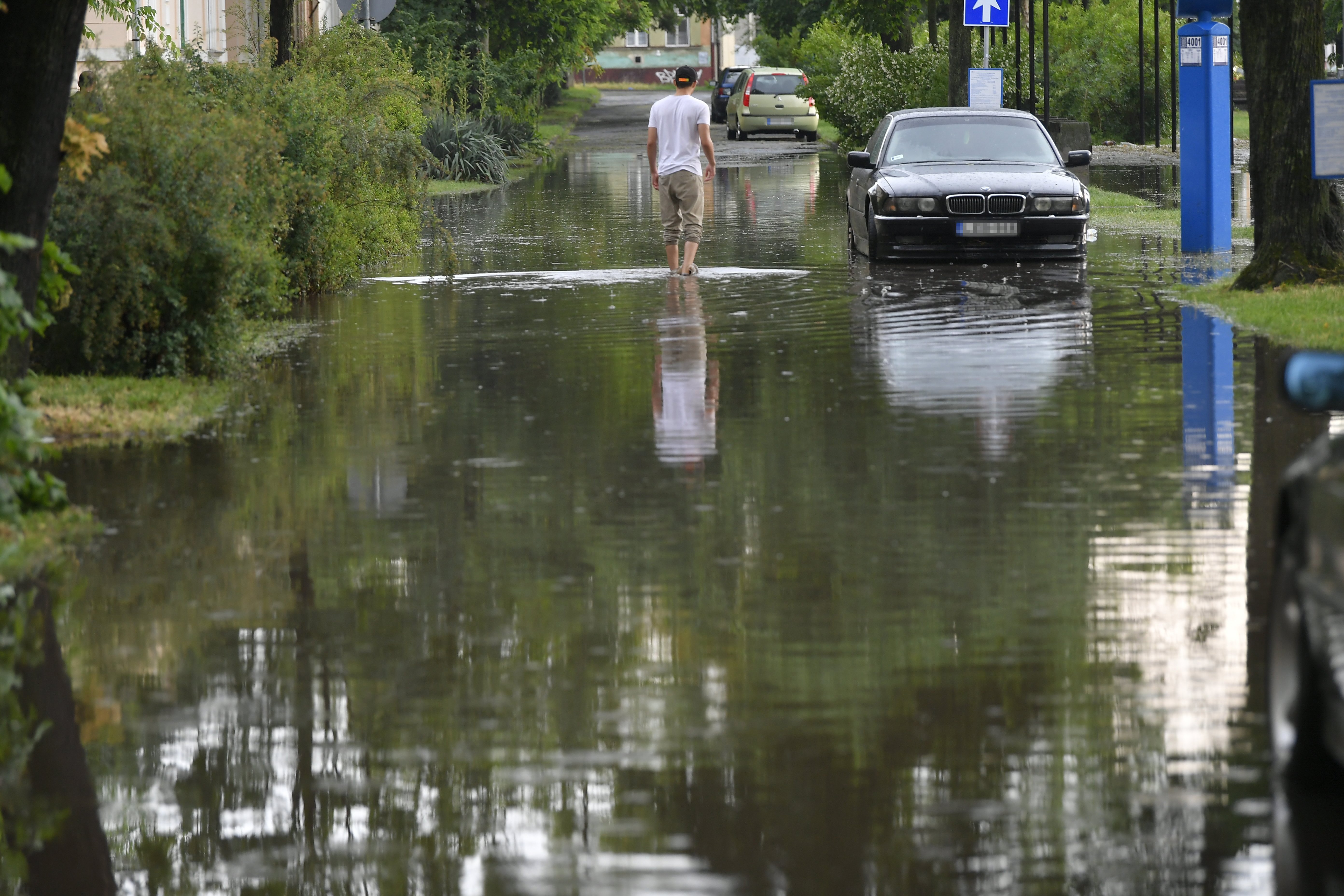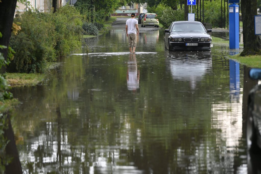 Egy férfi megy szakadó eső után a debreceni Bem téren 2018. május 27-én. MTI Fotó: Czeglédi Zsolt[/caption]