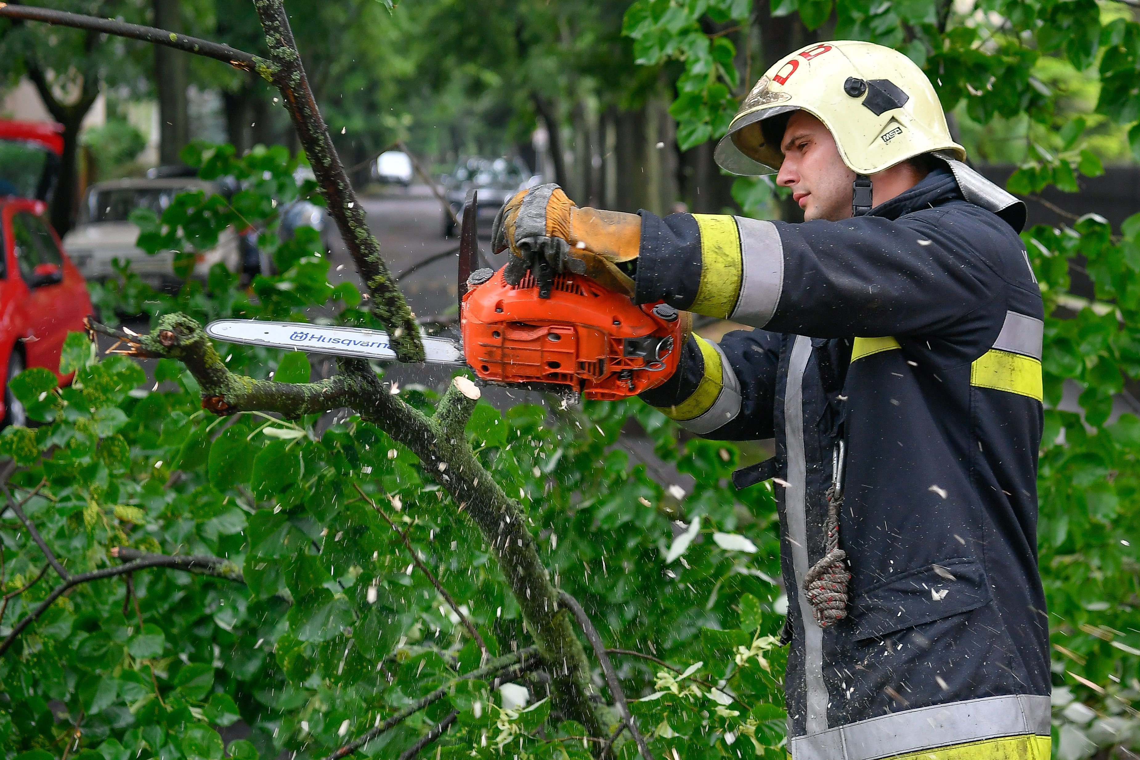 Tűzoltó szakadó eső után leszakadt faágat vág el motoros láncfűrésszel a debreceni Dobsina utcában 2018. május 27-én. MTI Fotó: Czeglédi Zsolt[/caption]