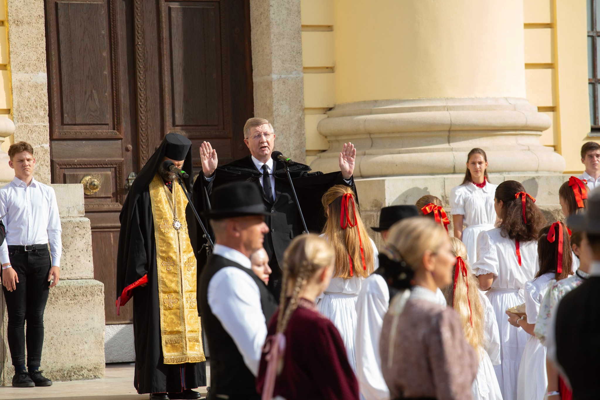 A hagyományoknak megfelelően a felvonulás előtt a város főterén felvonták a nemzeti lobogót, a Református Nagytemplom előtt pedig a történelmi egyházak vezetői ? Kocsis Fülöp görögkatolikus érsek-metropolita, Fekete Károly református és Palánki Ferenc római katolikus püspök ? megáldották az újbúzából kisütött kenyeret.