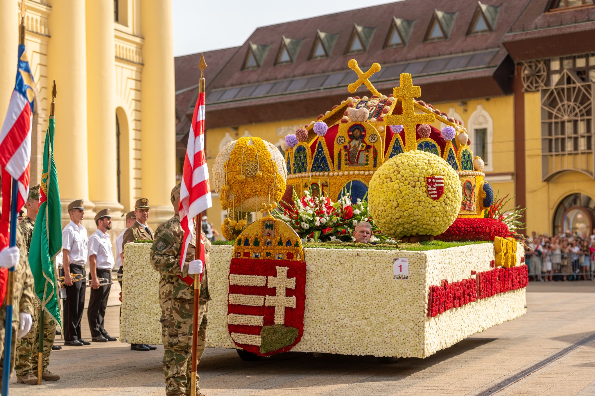 Debrecen, 2022. augusztus 20.Debrecen és Nagyvárad testvérvárosi kapcsolatait megjelenít? virágkocsi a debreceni virágkarneválon 2022. augusztus 20-án. Több tízezren nézték végig az idei virágkarnevált: tizenhárom színes virágkocsi vonult végig a belvárosból a Nagyerd?be, köztük különböz? m?vészeti csoportok 1200 táncosa és zenésze teremtett fergeteges hangulatot.