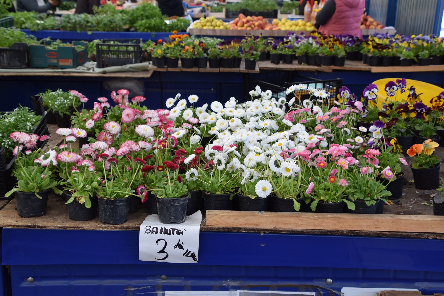 A függő virágtartós muskátli 15-25 lej, a kiültetésre váró pedig 7-8 lej, a csüngő petúnia 25-30 lej. A verbéna, a petúnia, a százszorszép 2 lej.