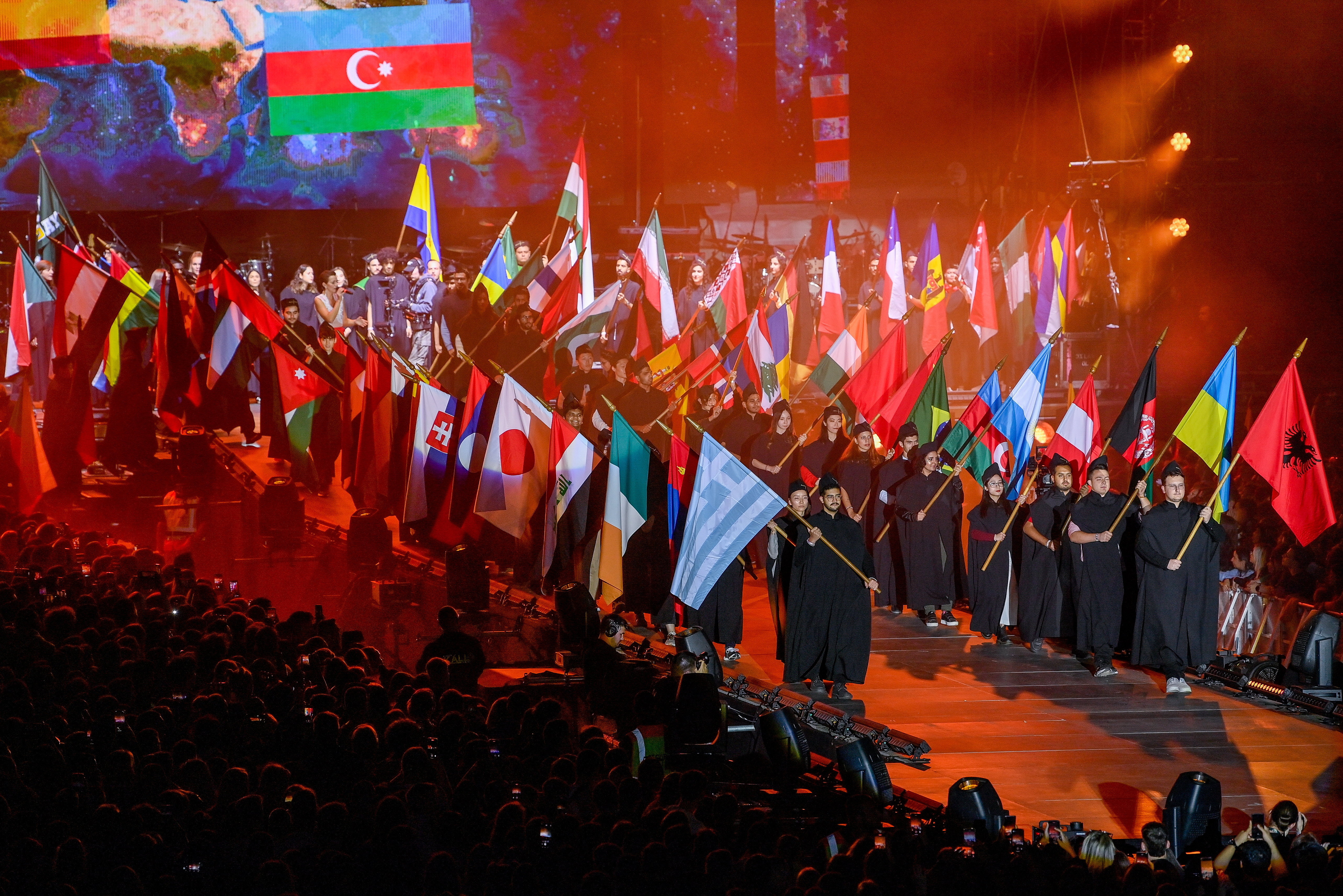 A Debreceni Egyetem hagyományainak megfelelően idén is az intézmény külföldi hallgatói közösségének zászlós bevonulásával kezdődött a rendkívüli tanévnyitó. A tavalyihoz képest kétszer több, összesen 110 zászlót vonultattak fel a szervezők a show kezdetén.