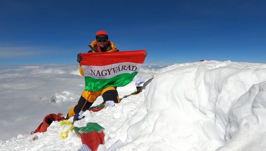 A Kárpát-medencei magyarságnak kívánt kitartást, miután meglobogtatta a Nagyvárad feliratú magyar zászlót Varga Csaba a Dhaulagiri 8167 méter magas csúcsán.