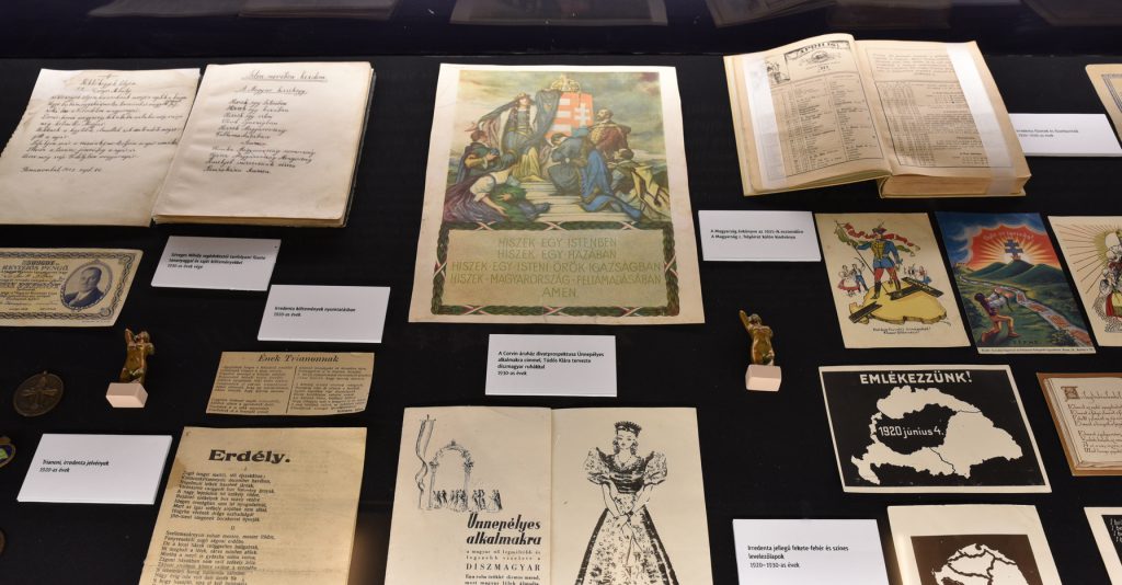 A veszteségek és a menekültek világa mellett az irredenta kultusz szintén helyet kapott a kiállításban, hiszen a revizionizmus és irredentizmus szellemében készült a szellemi és tárgyi termékek nagy része. Az irredenta elemek megjelenésével a gyászos, komor hangulat egyszerre erősödött és ?oldódott?, a mindennapok, a korabeli szokások, tárgyak átalakultak, új tartalommal, jelentéssel bővültek, amelyek mind a revízió követelésével, az igazságtalanság hangoztatásával és kifejezésével függtek össze. Az irredenta kultusszal szorosan összekapcsolódott a nemzeti jelleg hangsúlyozása, az öltözékben például magyaros díszítések, elemek jelentek meg. A kiállított tárgyak között megtaláljuk a mindennapi használati tárgyakat és a személyes elemeket is.